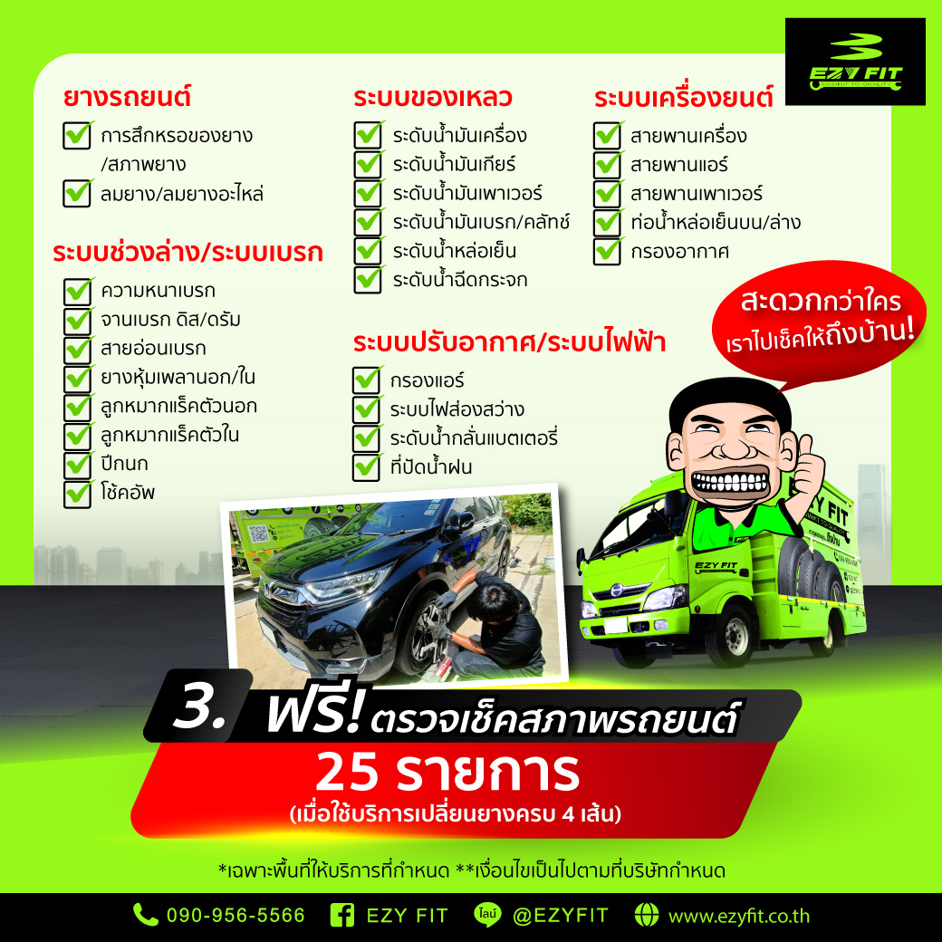 3.ฟรี ตรวจเช็คสภาพรถยนต์ 25 รายการ (เมื่อใช้บริการเปลี่ยนยางรถยนต์ครบ 4 เส้น)