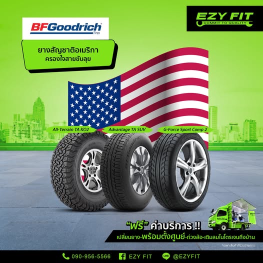 อีซี่ฟิต (EZY FIT) จัดจำหน่ายยาง BFGoodrich ทุกรุ่น ในราคาที่คุ้มค่า และโปรโมชันดี ๆ มากมาย เราพร้อมให้บริการเปลี่ยนยางรถยนต์ ตั้งศูนย์ ถ่วงล้อ และเติมลมไนโตรเจน
