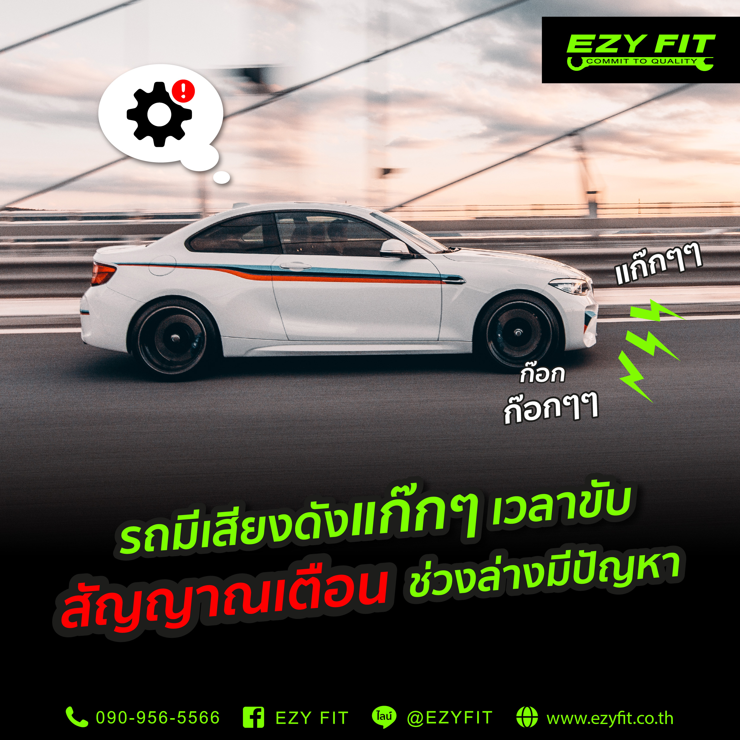 อาการรถมีเสียงดังแก๊กๆ เวลาขับ โดยส่วนใหญ่จะเป็นผลมาจากการชำรุดของอะไหล่ส่วนต่างๆ ของระบบช่วงล่าง โดยเป็นส่วนที่รับแรงกระแทกและช่วยลดการสะเทือนของตัวรถ สามารถเกิดการความเสียหายได้หากมีการใช้งานที่ไม่ระมัดระวังบ่อยๆ เช่น การขับผ่านทางขรุขระ การขับผ่านลูกระนาด การขับผ่านหลุม โดยไม่ชะลอความเร็ว สิ่งเหล่านี้เป็นพฤติกรรมที่ส่งผลเสียต่อระบบช่วงล่างเป็นอย่างมาก หากคุณรู้สึกไม่มั่นใจว่าระบบช่วงล่างยังอยู่ในสภาพที่พร้อมใช้งานหรือไม่ สามารถปรึกษาช่างผู้เชี่ยวชาญกับ EZY FIT ได้ทันที พร้อมให้บริการให้ถึงบ้านคุณ โทร. 090-956-5566 หรือติดต่อผ่าน Line OA @EZYFIT