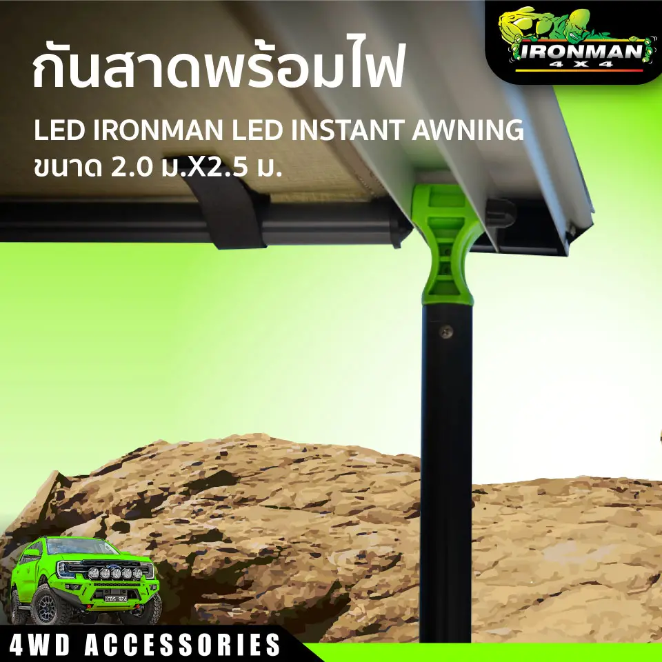 กันสาดขนาด 2.0 ม.X2.5 ม.มาพร้อมกับไฟ LED ช่วยให้ความสว่างในยามค่ำคืน มาพร้อมชุดติดตัง สามารถติดตั้งกับแร๊คหลังคาทั่วไป ติดตั้งกับรถ SUV กระบะหรือรถตู้ก็ได้ จะติดข้างเดียวหรือ2ข้างตามความชอบ