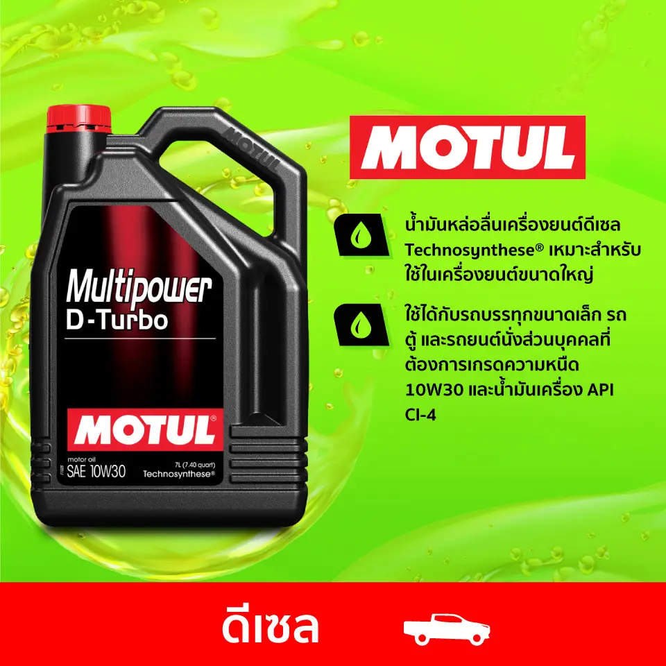MULTIPOWER D-TURBO 10W-30 7L เหมาะสำหรับเครื่องยนต์ดีเซลทั้งรุ่นเก่าและใหม่ ที่มีระบบหมุนวนไอเสีย (EGR) รองรับทั้งรถ SUV, รถกระบะขนส่ง, รถตู้, รถโดยสาร