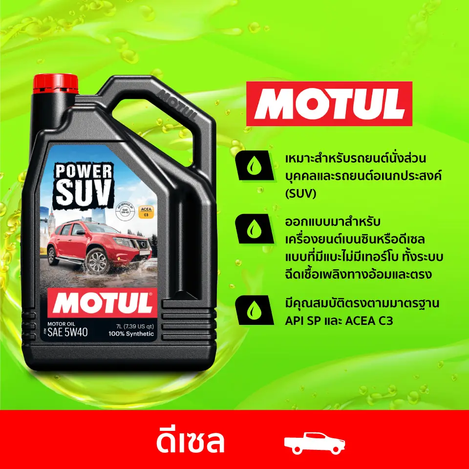 5W-40 7L ออกแบบมาสำหรับเครื่องยนต์ดีเซลของรถ SUV,PPV และรถปิคอัพ ที่ใช้ระบบอัดอากาศหรือเทอร์โบชาร์จ เหมาะสำหรับใช้ในเมืองหรือออฟโรด