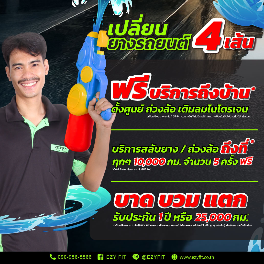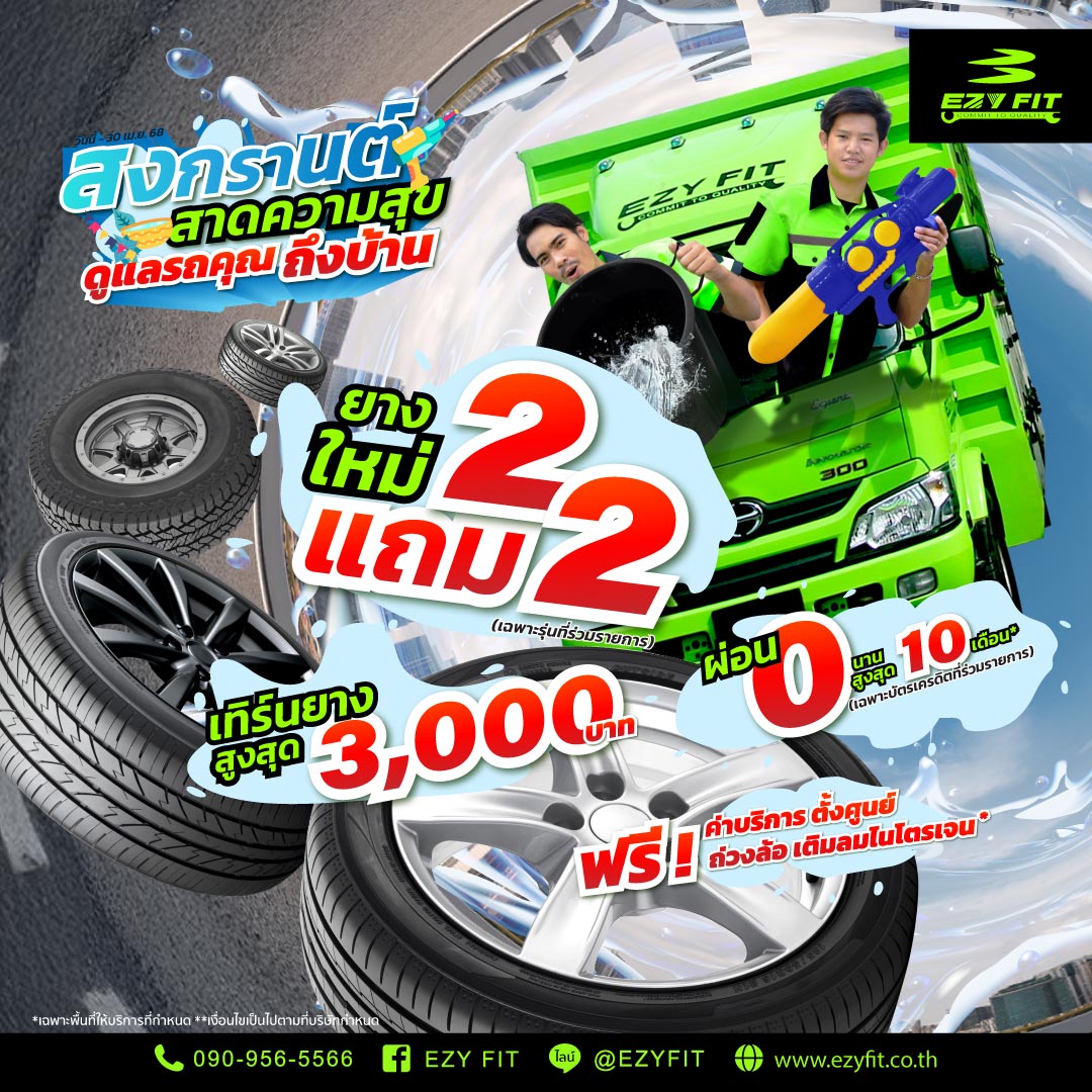 อีซี่ ฟิตขอสาดโปรโมชั่นชุ่มฉ่ำรับสงกรานต์ l รับส่วนลดเทิร์นยางสูงสุด 3,000 บาท ยางซื้อ 1 แถม 1 ฟรีให้บริการถึงบ้าน....
