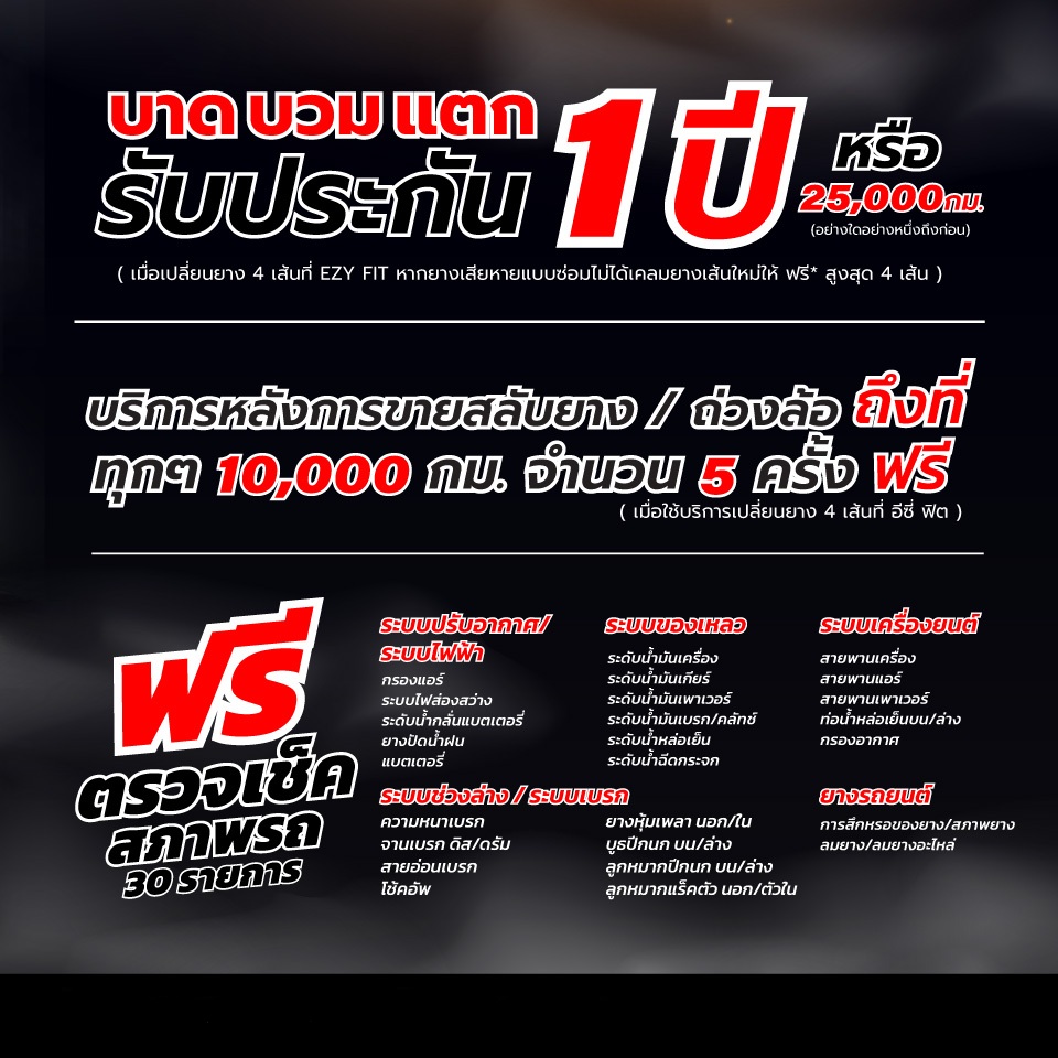 📋 รับประกัน บาด บวม แตก เคลมฟรี 1 ปี หรือ 25,000 กม.